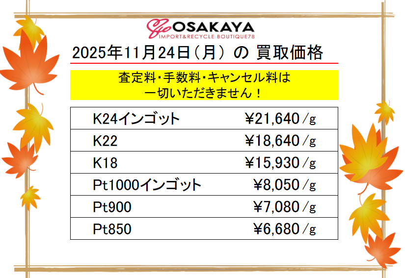<11/24>高価買取の大阪屋!本日の金プラチナ買取価格をお知らせします!