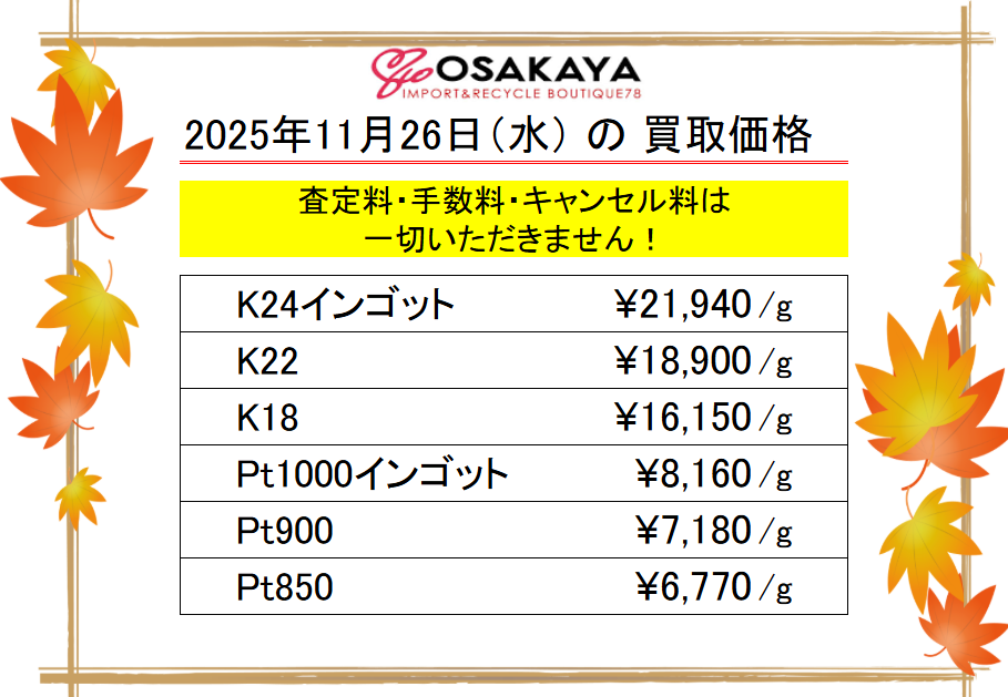 <11/26>高価買取の大阪屋!本日の金プラチナ買取価格をお知らせします!