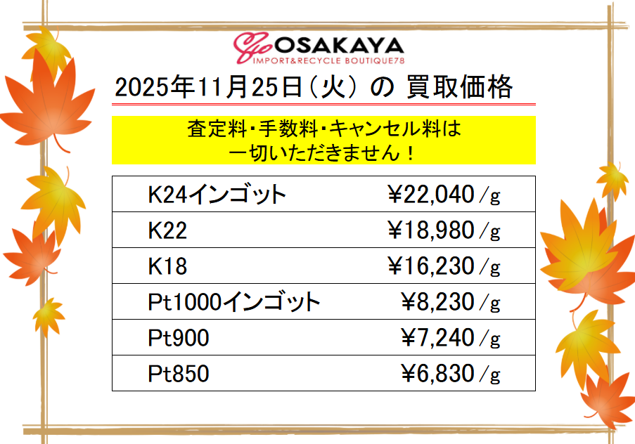 <11/25>高価買取の大阪屋!本日の金プラチナ買取価格をお知らせします!