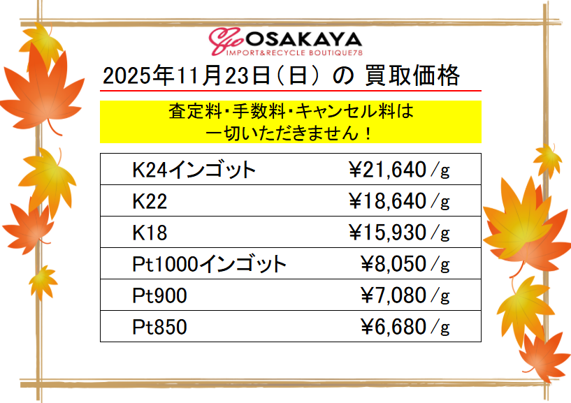 <11/23>高価買取の大阪屋!本日の金プラチナ買取価格をお知らせします!