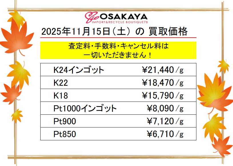 <11/15>高価買取の大阪屋!本日の金プラチナ買取価格をお知らせします!