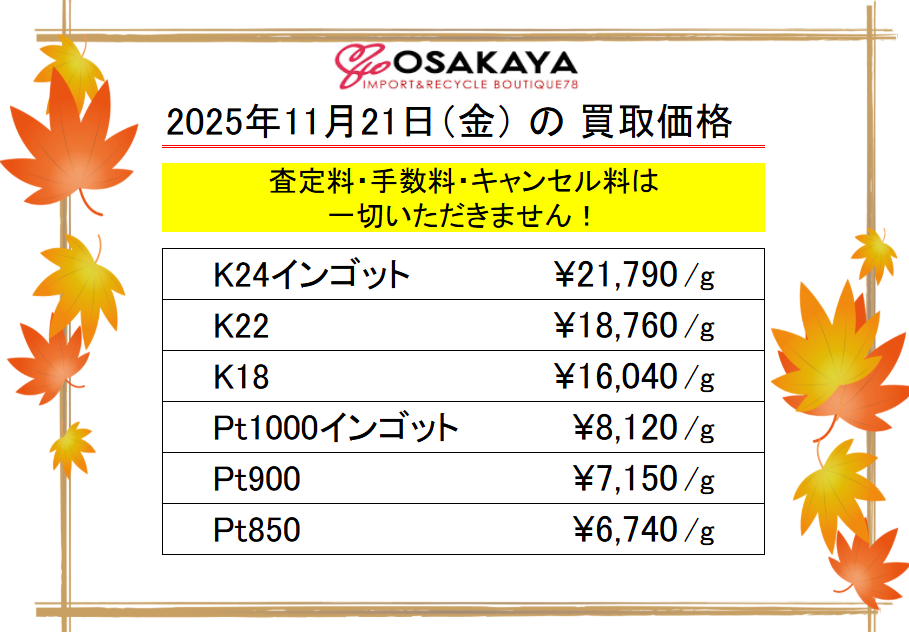 <11/21>高価買取の大阪屋!本日の金プラチナ買取価格をお知らせします!