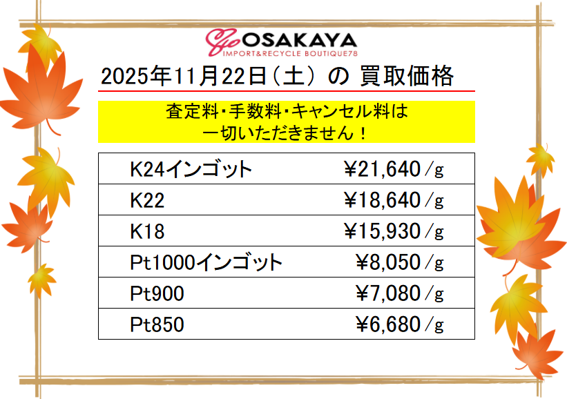 <11/22>高価買取の大阪屋!本日の金プラチナ買取価格をお知らせします!