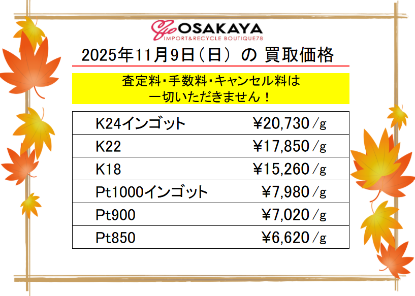 <11/9>高価買取の大阪屋!本日の金プラチナ買取価格をお知らせします!