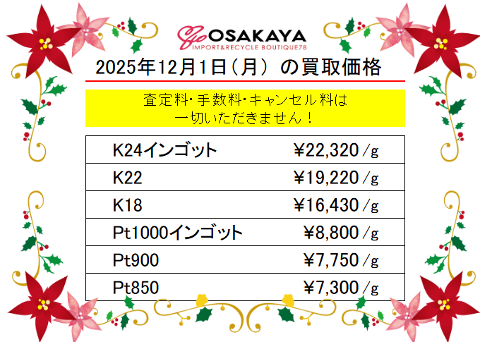 <12/1>高価買取の大阪屋!本日の金プラチナ買取価格をお知らせします!